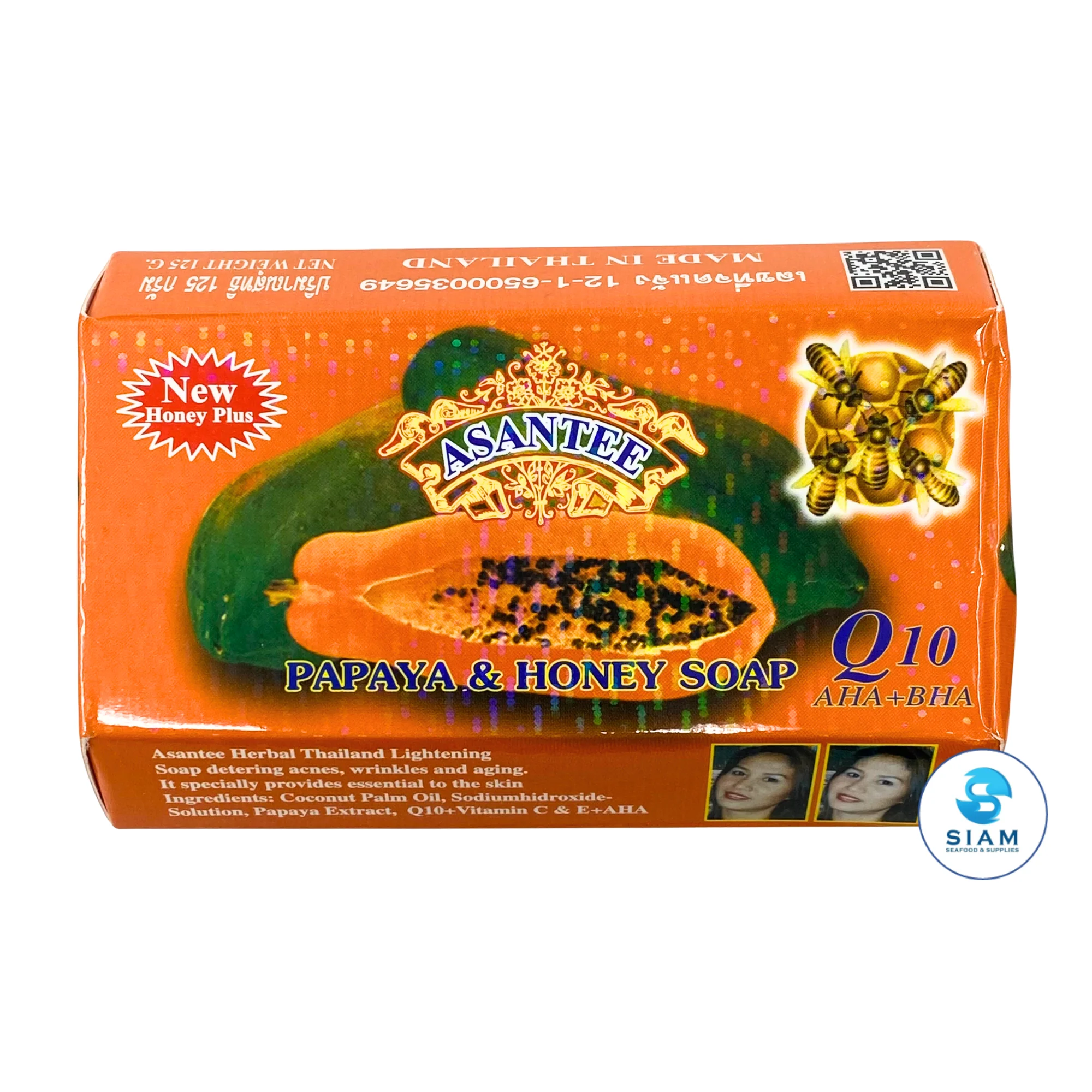 (6-Pack) Asantee Papaya & Honey Soap is a herbal soap bar enriched with papaya extract, honey, Q10, Vitamin C, Vitamin E, and AHA. It helps cleanse the skin while leaving it feeling refreshed and smooth after use.
